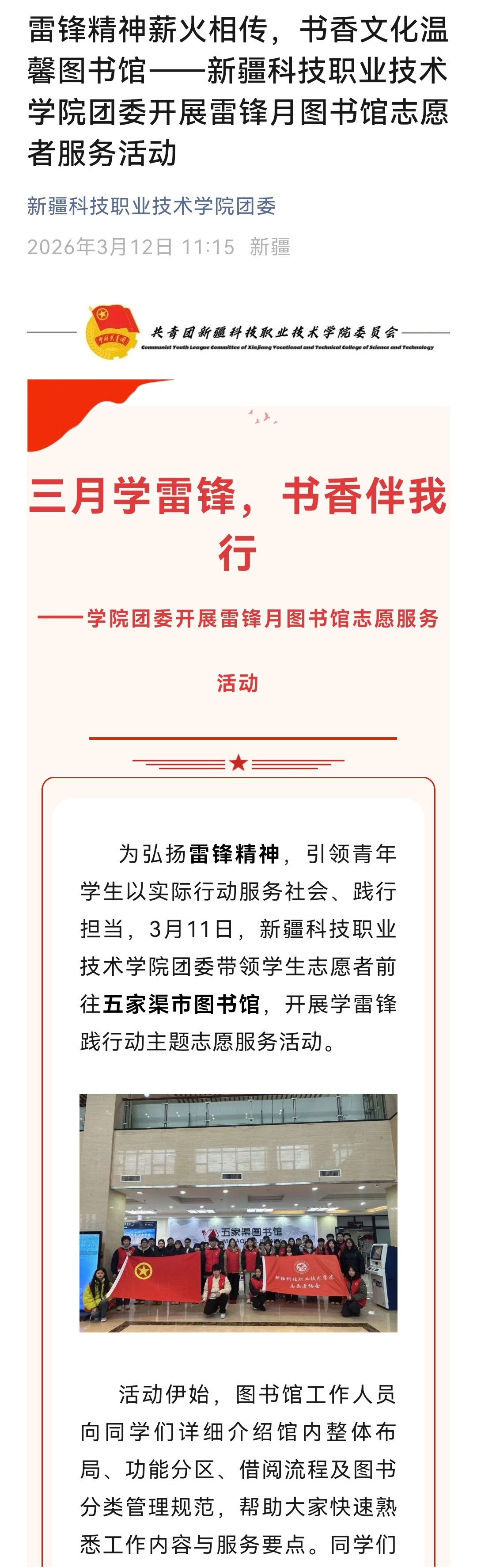 雷锋精神薪火相传,书香文化温馨图书馆——新疆科技职业技术学院团委开展雷锋月图书馆志愿者服务活动