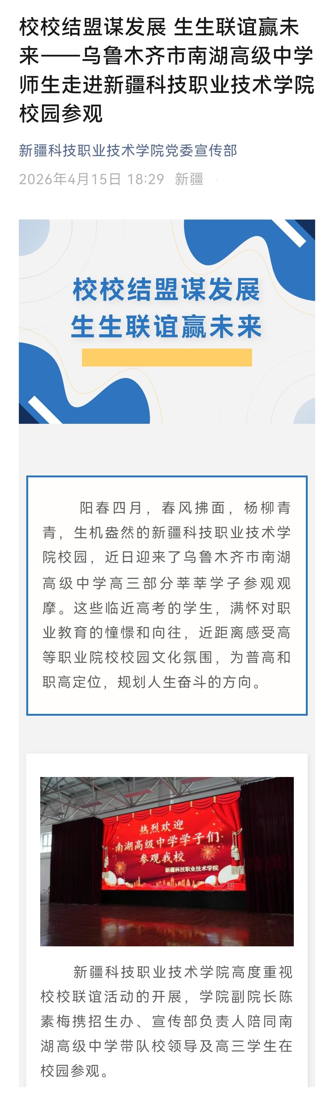 校校结盟谋发展 生生联谊赢未来——乌鲁木齐市南湖高级中学师生走进新疆科技职业技术学院校园参观