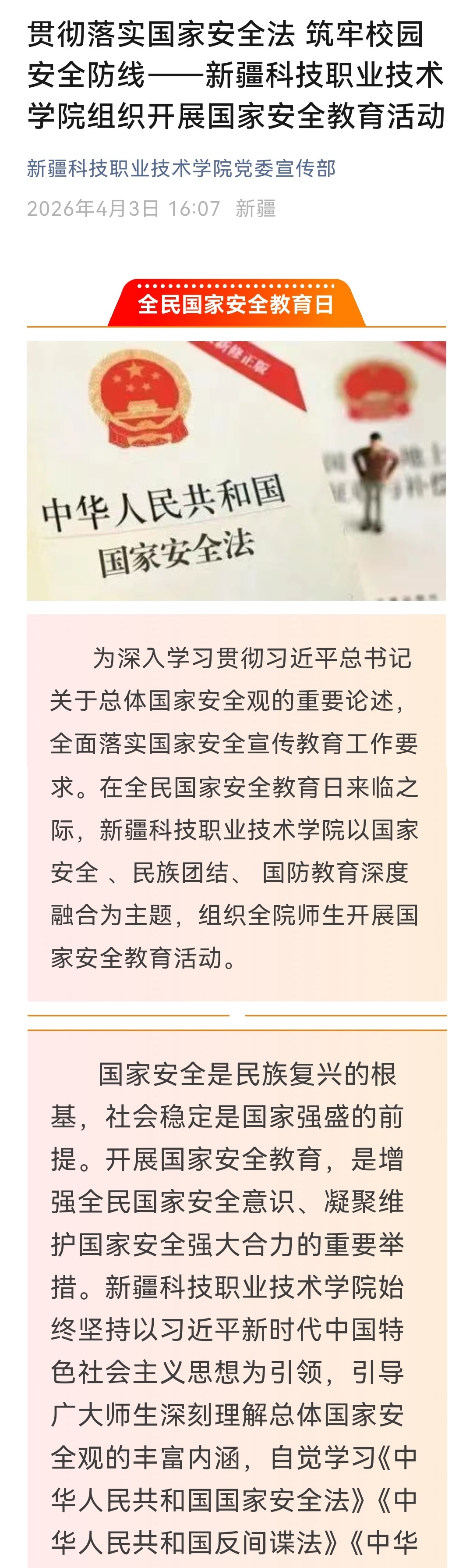 贯彻落实国家安全法 筑牢校园安全防线——新疆科技职业技术学院组织开展国家安全教育活动